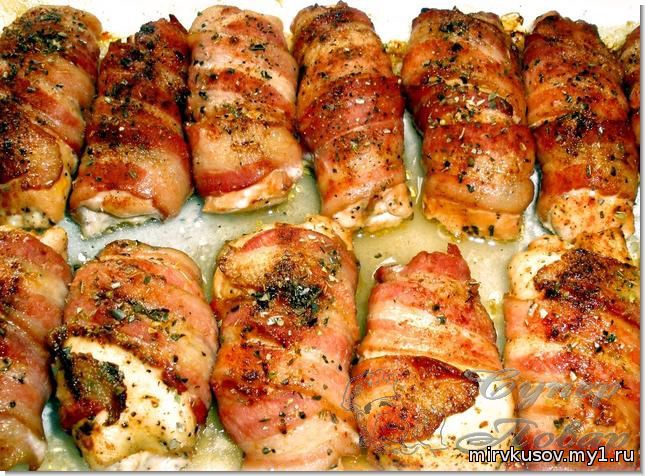 Каждый рулет оберните беконом,вложив между рулетами и беконом по веточке тимьяна.